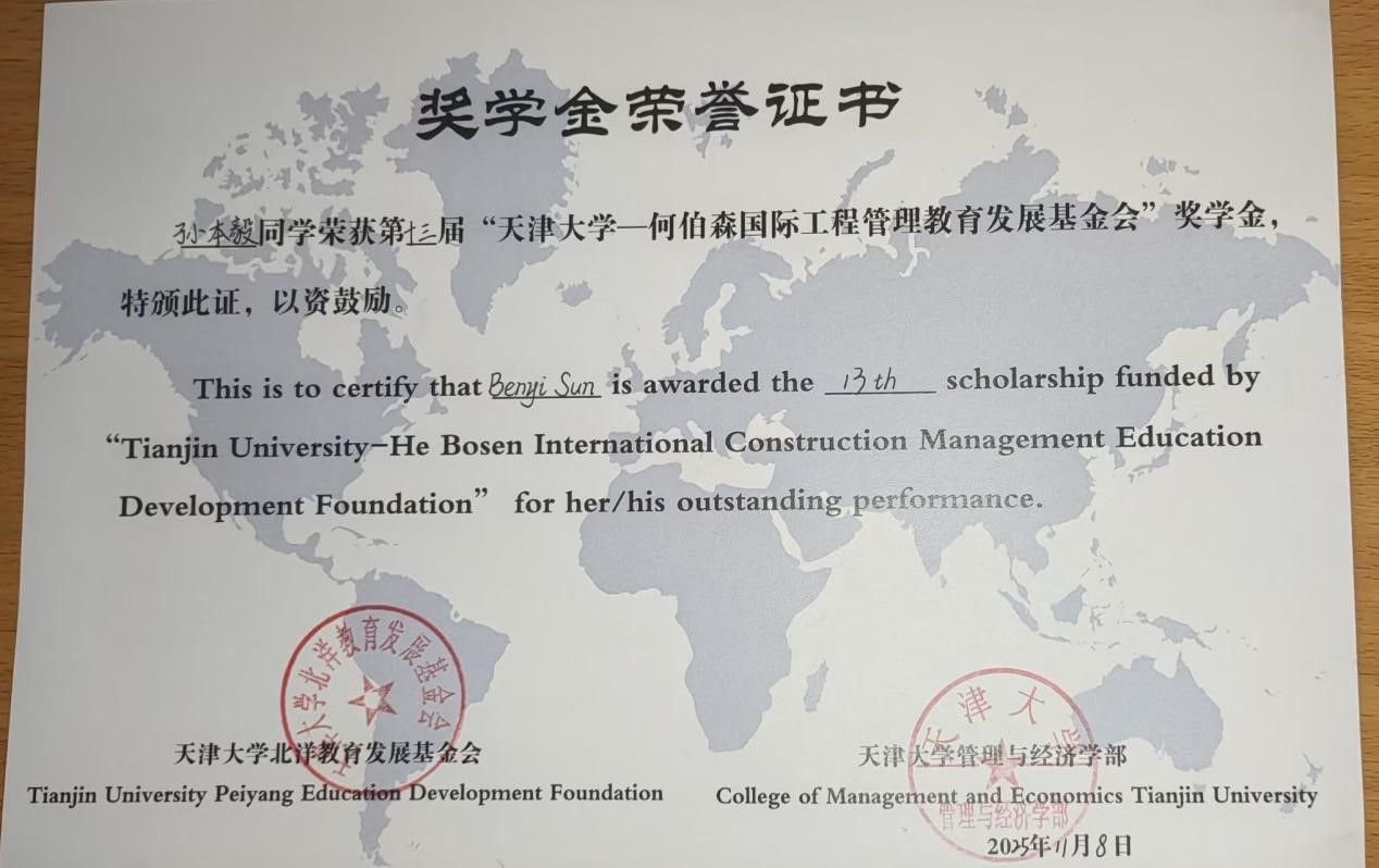2025118日上午,第十三届天津大学何伯森国际工程管理教育发展基金奖学金评定会暨颁奖仪式于天津大学26A209室隆重举行。偷拍视频 22级本科生孙本毅同学是本届的七位外校获奖者之一。